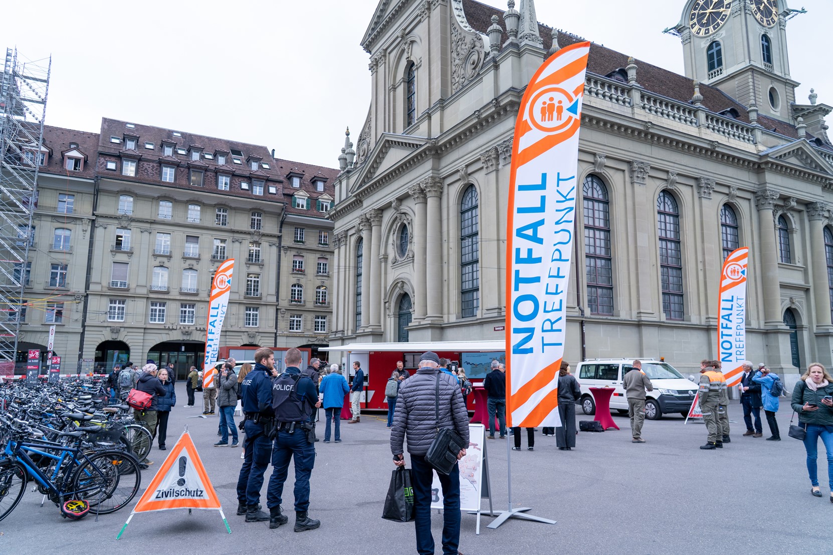 Anlässlich des «Internationalen Tages der Katastrophenvorbeugung» am 13. Oktober wurde auf dem Bahnhofplatz in Bern ein mobiler Notfalltreffpunkt eingerichtet, um den jährlichen Verbindungstest durchzuführen. Regierungsrat Philippe Müller und Gemeinderat Alec von Graffenried betonten in diesem Rahmen die Wichtigkeit der Notfalltreffpunkte für die Bevölkerung.